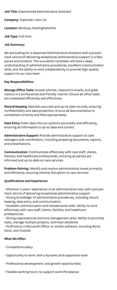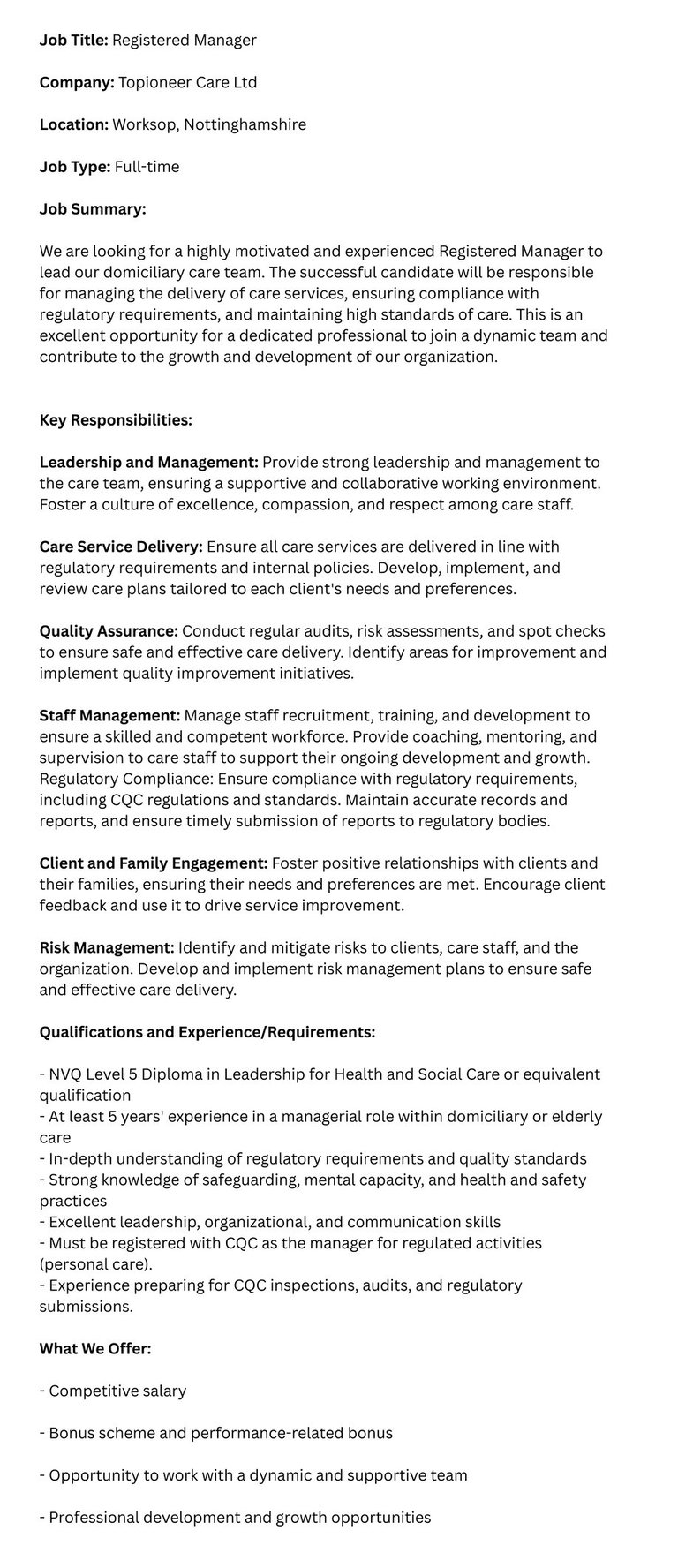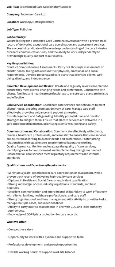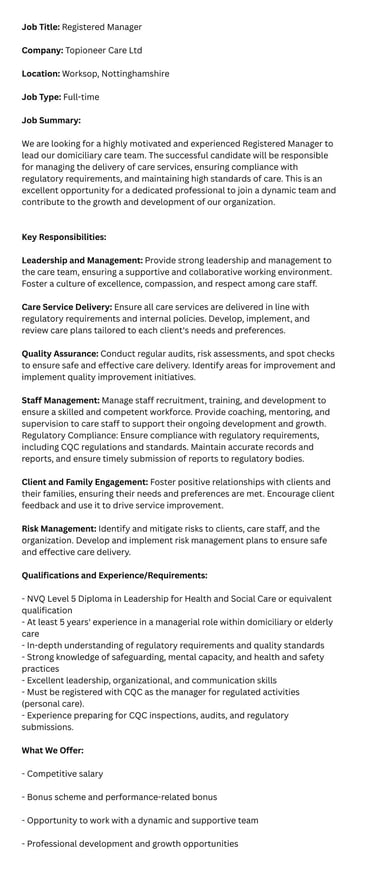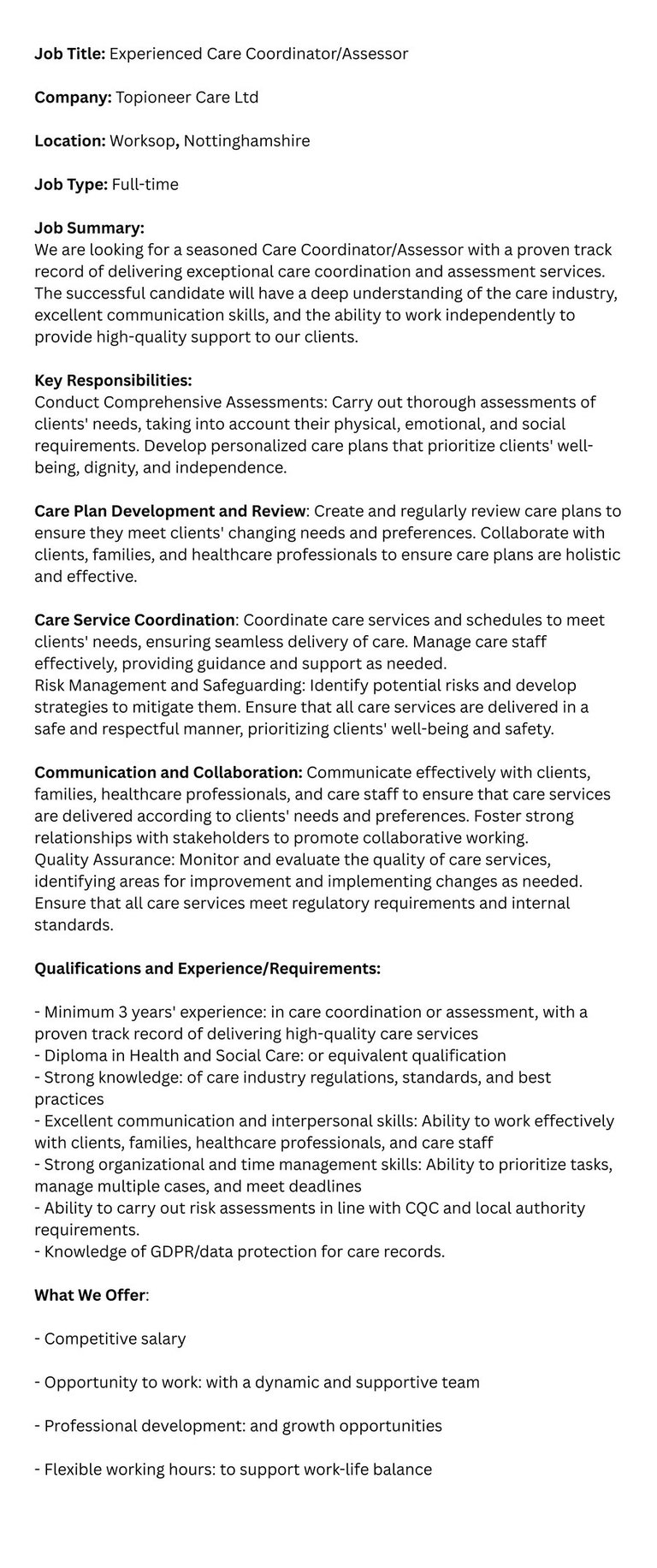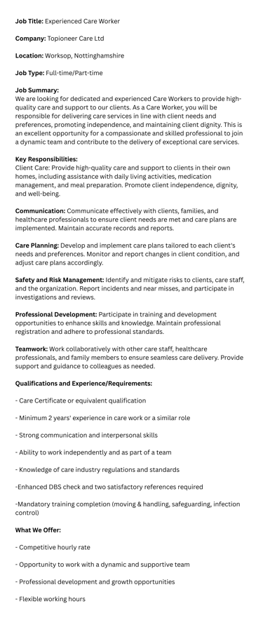 Topioneer Care Ltd is a leading provider of domiciliary care services, dedicated to delivering high-quality support to individuals in the comfort of their own homes. We are seeking experienced and skilled Care Workers to join our team and provide exceptional care to our clients.